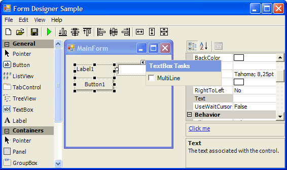 After activation of Form Designer .Net you can select, move and resize any control in your form by keys or mouse. Form with activated Form Designer .Net looks exactly like Microsoft .Net designer in Visual Studio or Delphi.