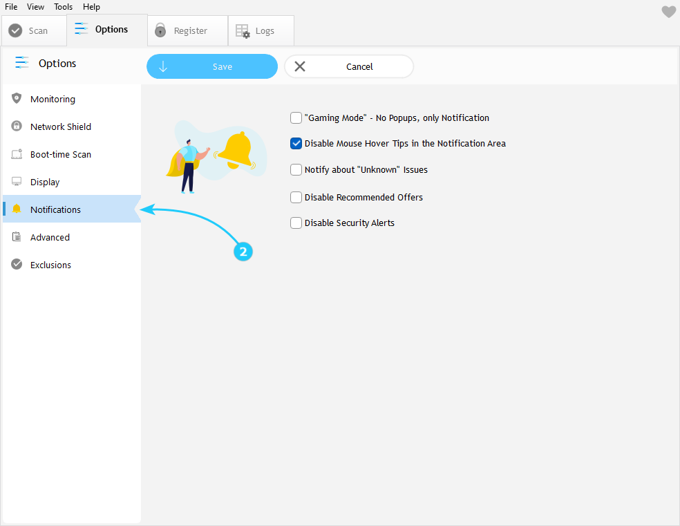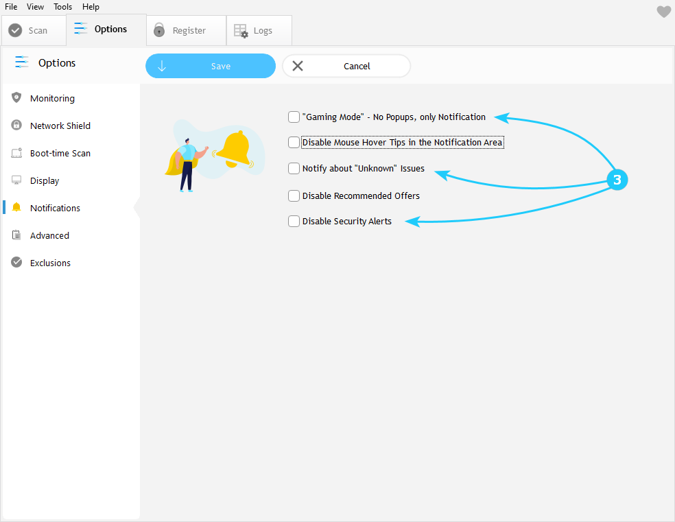 - Check the boxes with preferred options to configure UnHackMe notifications.