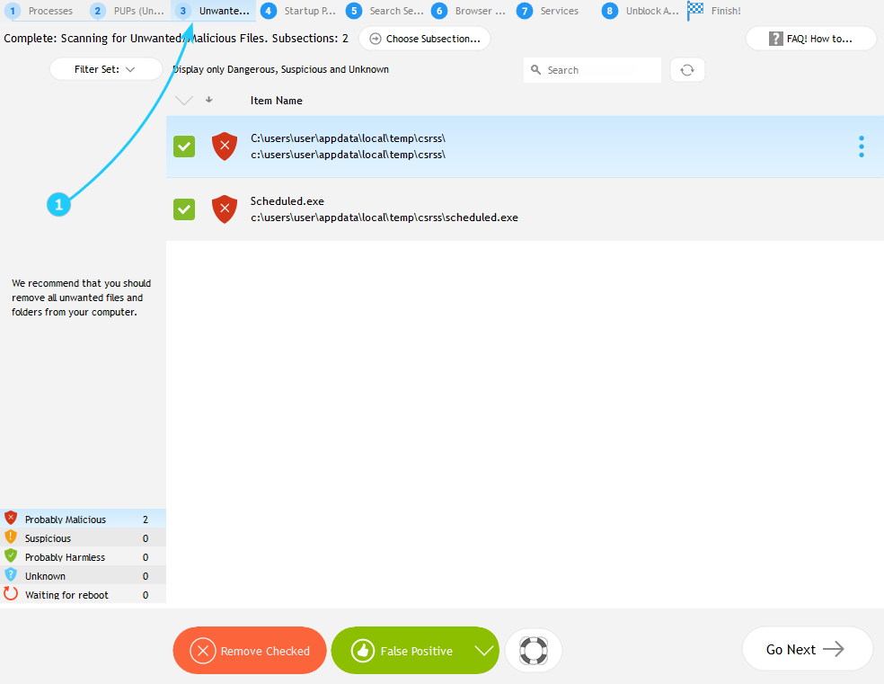 - In the scan results window, navigate to Unwanted Files tab (number 3) to inspect threats detected by UnHackMe.