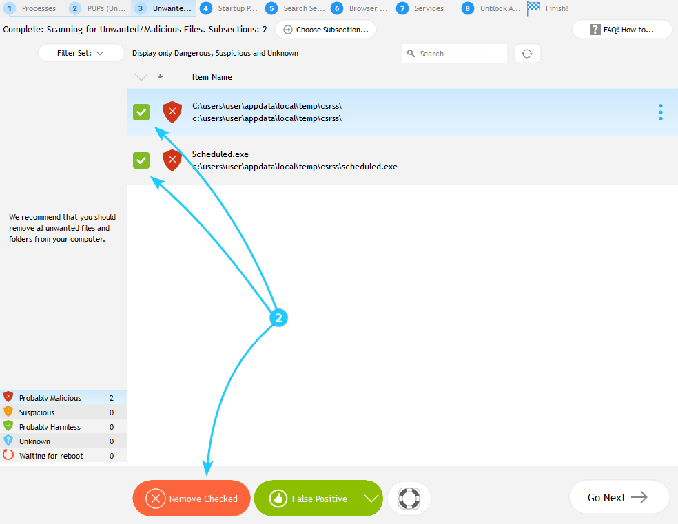 - UnHackMe highlights known malicious files with red symbol. Select the unwanted files by checking the boxes next to them, then click Remove Checked button to to initiate the deletion of the selected items.
