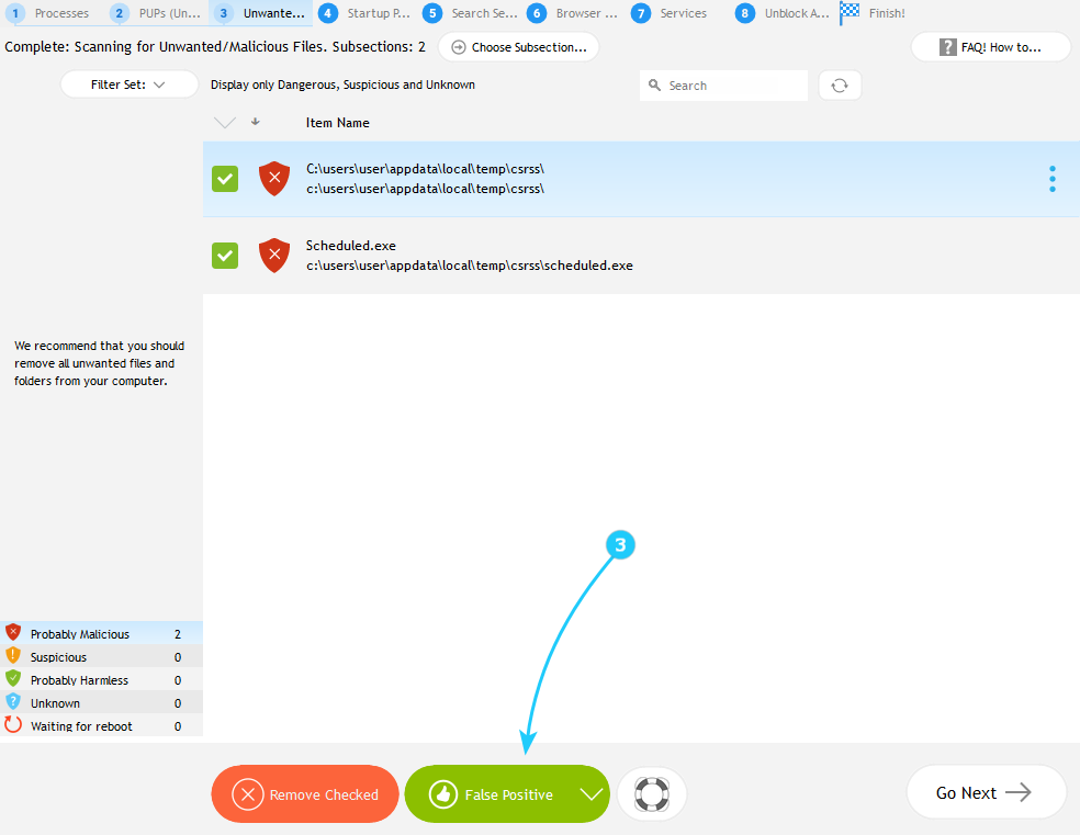 - If a safe file is incorrectly flagged, select it and click False Positive.