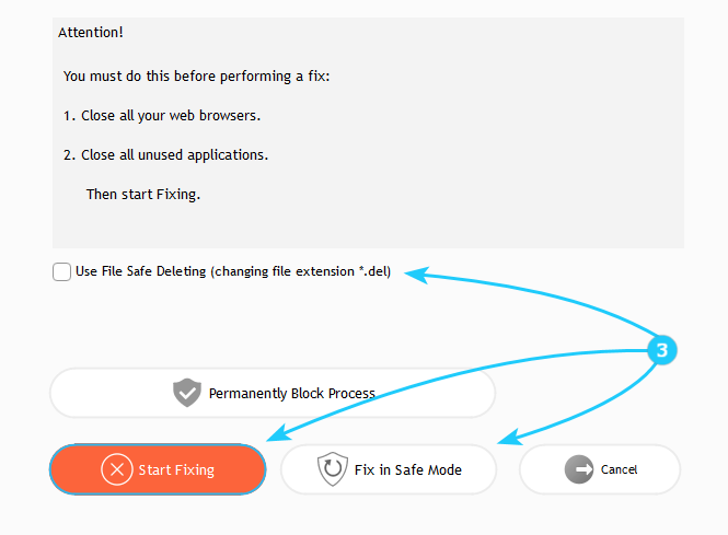 - Before proceeding, close all browser and applications and save all your ongoing work, then configure the removal method by checking the preferred options. Those include File Safe Deleting (which renames to .del instead of deletion). Use Fix in Safe Mode button for persistent malware and locked files.