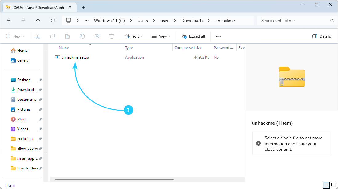 1. Open the downloaded "unhackme.zip" file in your Downloads folder, then double-click "unahckme_setup.exe" to start the installation.