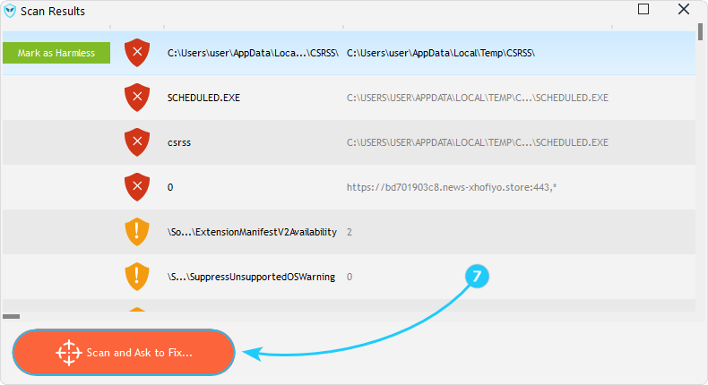 - The scan results window will show possible threats found by UnHackMe. To start fixing them, click Scan and Ask to Fix button.