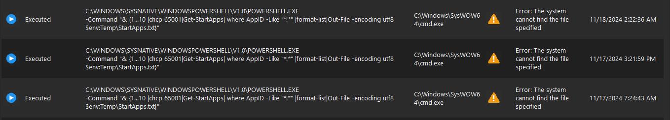 It is the PowerShell command that collects information about startup programs and saves it to the "temp\startapps.txt" file. I found that IOBIT programs( PPUninstaller.exe) and VoodoShield use this command.