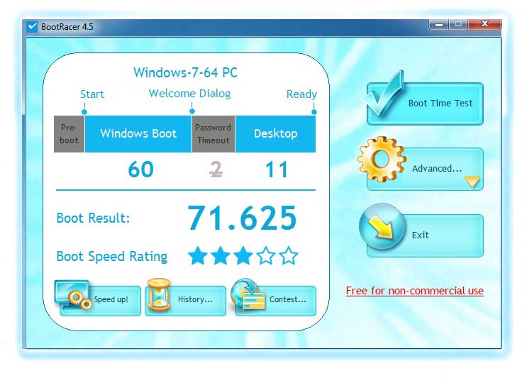 How long does your computer take to load? BootRacer is designed to answer this question. The tool measures exactly how long it takes your computer to fully load every time it′s started up. Is your system slowing down? BootRacer will tell you exactly how much longer it takes to boot up compared to its past performance, warning you immediately when your PC starts showing signs of slowing down. BootRacer is easy on resources, and does not make your boot time a single second longer. And here is the best part: it′s completely free for personal use with no adware, malware, searchware, toolbarware or other ‘bundle’ware! In other words, it′s free and totally harmless at the same time!