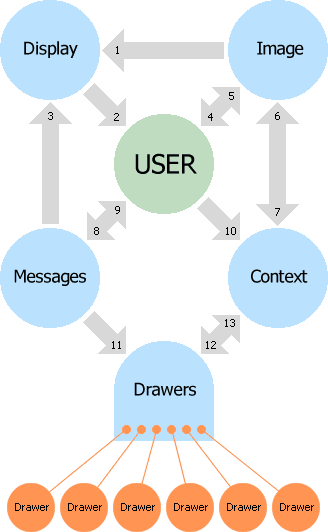 As you can see, USER during seeing (2) and editing images produces mouse and key events (8), which are processed by Messages part, translated to Display for zooming and scrolling (3) and converted to Drawers' method calls (11). Drawers is a collection of drawer objects (TCustomDrawer descendants) and each of them has simple set of methods (StartDraw, Draw, StopDraw, etc.) which are used for editing the image. Each drawer operates with Context (12), that includes ForeColor, BackColor, Tool, Mode, Option and Value property, which can be changed by USER (10), Canvas, distrubuted by Image (7) and special context properties DrawerData and DrawerObject which are used by drawers for storing any drawing data (13). When canvas of Image is changed (6), the Image invalidates Display to show all the changes (1). Also USER are notified about some important changes by special events (9). Of course, the edited image can be obtained (4) for any external processing and can be put back to the editor (5).