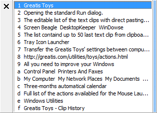 Toys' Clip History saves up to 50 last text clips from the clipboard and can show them in the special window. All items in the list can be numerated for fast access by one key pressing. The clip is pasted automatically into current text editor.