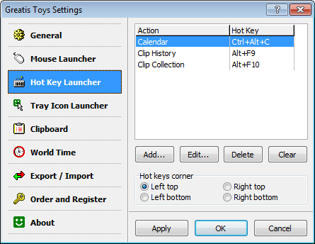 The Toys' Hot Key allows to run any application, open any folder and access any Toys' feature by editable unlimited hot key list.